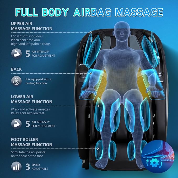 - ✔️【BODY DETECTING PERSONALIZED MASSAGE】 Our full body massage chair is designed to provide personalized comfort and relaxation. It automatically scans your body type and adjusts the position of the shoulders accordingly. You can customize the shiatsu points, angle of lying down, strength, and mode of the airbag full body massage, as well as the width of the back and back area. The footrest can also be auto extended to accommodate the length of your legs, ensuring a customized massage experience.