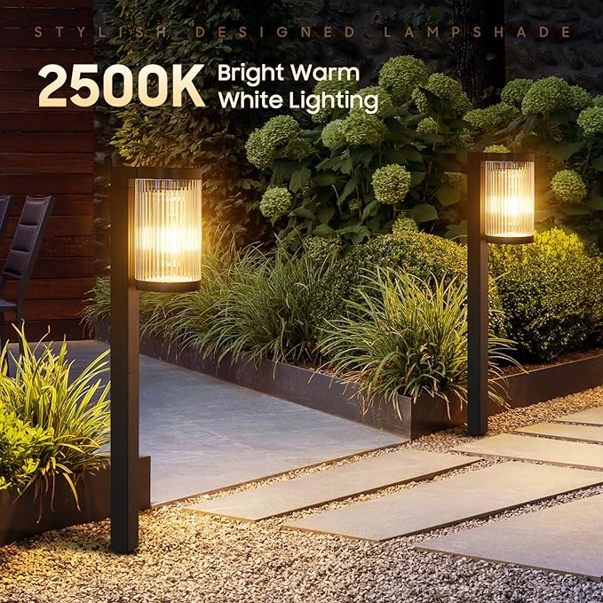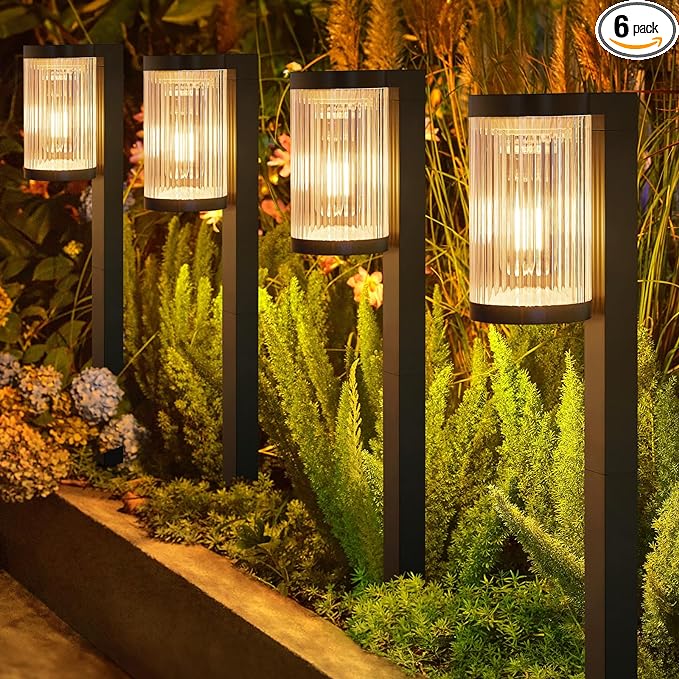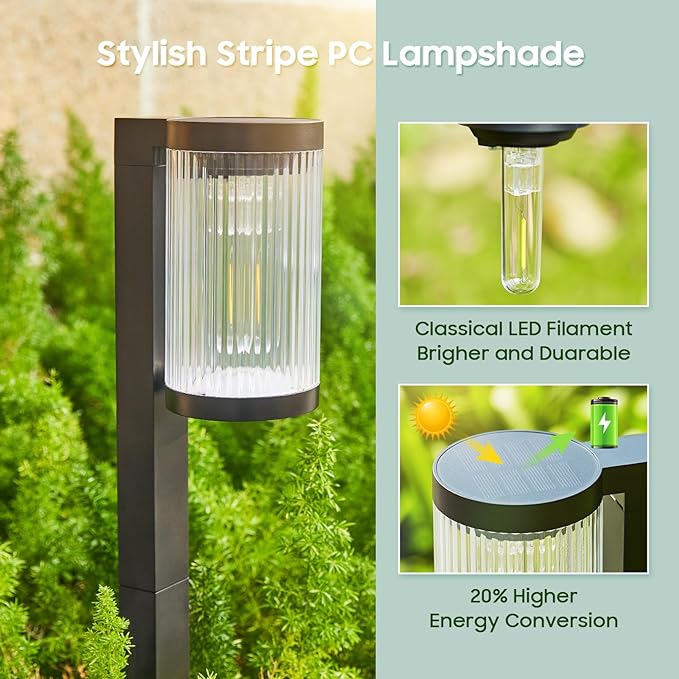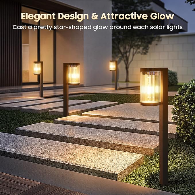 - STYLISH DESIGN WITH ATTRACTIVE GLOW: Specially combined the modern stripe lampshade with classical LED filament, our HALHSAP solar pathway lights look more elegant and textured, offering a 2500K warm white lighting and a star-shaped glow in the ground around each solar garden lights. This unique design adds a touch of beauty and charm to the solar outdoor lights, enhancing your outdoor living experience.